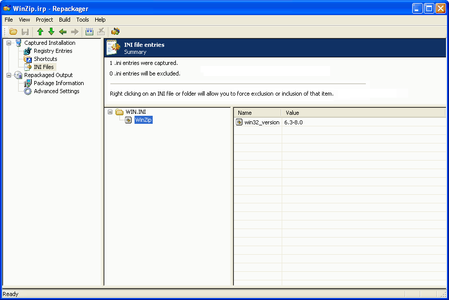 From the INI Files view, you can examine information about each captured .ini file, selectively exclude .ini files or .ini file sections from the package you are creating, or reinclude .ini files or sections that you previously excluded.