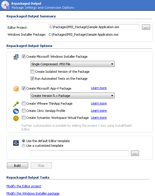 You can simultaneously build an InstallShield Editor project (.ism), a Windows Installer package (.msi), a Microsoft App-V application (4.x or 5.x), a ThinApp application, a Citrix profile, and/or a Symantec virtual application from your Repackager project (.irp). To do this, you need to select options on the Repackager Repackaged Output view.