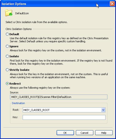 On the Registry Isolation Options dialog box, you can override the default Citrix isolation option for the selected registry key.