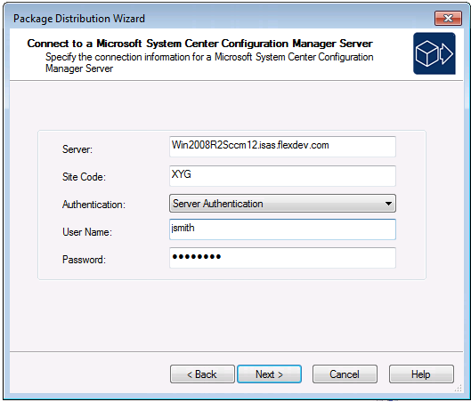 | Server | Enter the name of the ConfigMgr server that you want to connect to. Using the Package Distribution Wizard, you can publish Windows Installer packages and legacy setups to both System Center 2007 Configuration Manager and System Center 2012 Configuration Manager. However, the Package Distribution Wizard can only publish App-V 4.x packages to System Center 2007 Configuration Manager To publish applications to System Center 2012 Configuration Manager, you need to use the application-based Distribution Wizard, as described in Distributing Applications Using the Distribution Wizard. |
