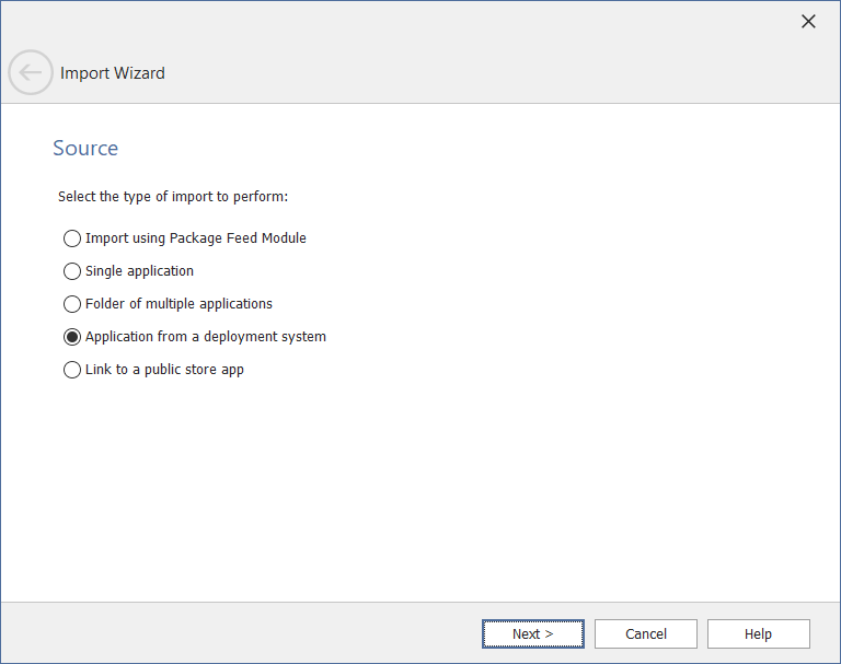 In the Source panel, select Packages from a deployment system / Application from deployment system and click Next. The Source Server Details panel opens.