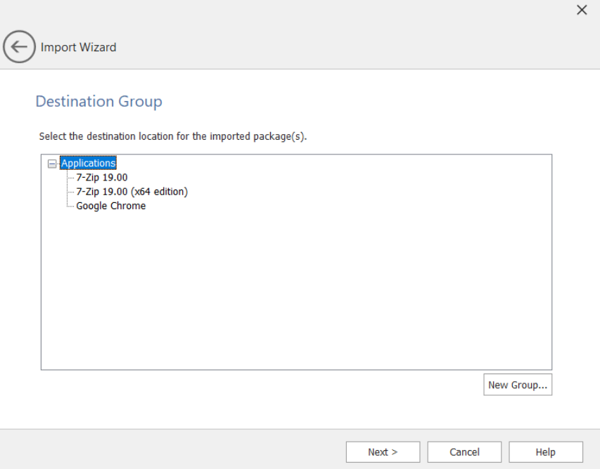 noteIf you launched the Import Wizard by selecting a group in the tree and then clicking Import, that group will be selected by default on the Destination Group panel