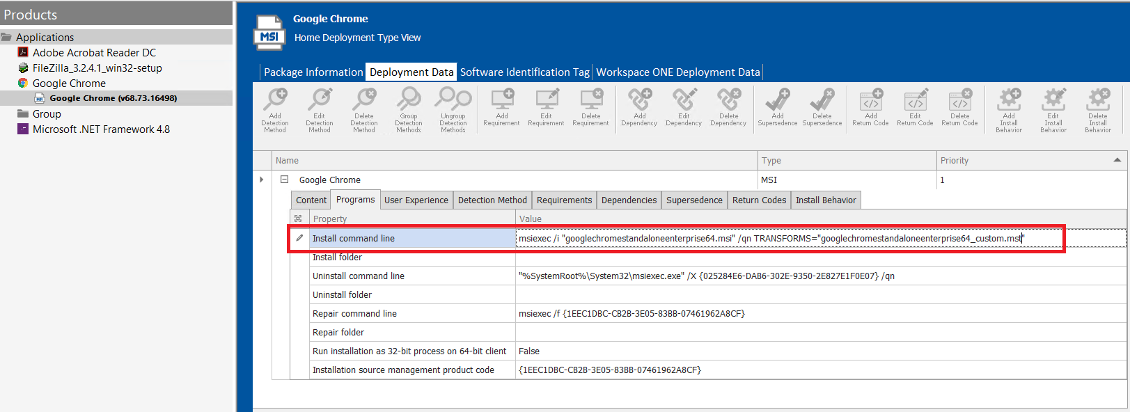 noteOn successful import of an application into the Application Catalog Tree, you can see the Install Command line and Uninstall Command Line for the selected application in Deployment Data >> Programs >> Install Command Line and Uninstall Command Line.