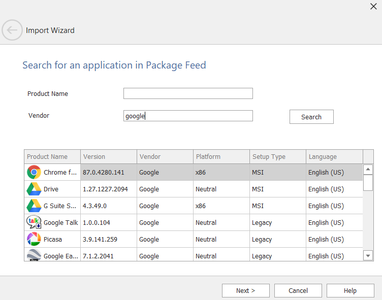 Click Next. When using the Package Feed Module, dynamic custom panels will appear in the Import Wizard based on the settings defined for each package. For example, when importing the Google Chrome package, several dynamic custom panel will appear, including the Options panel.