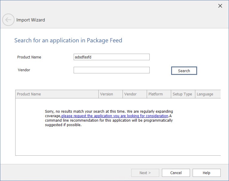 - If you search for a package that is not available in the package feed, you will see a hyperlink message. Clicking the hyperlink will open the New Package Request Wizard, where you can submit a package request.