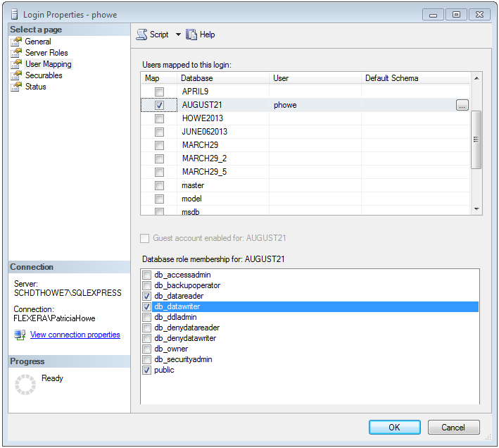In the Users mapped to this login list, select the database that you want to assign permissions to.