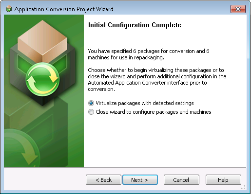 Enter login credentials and click Next. The Initial Configuration Complete panel opens, listing a summary of your selections, and prompting you to select whether you want to begin to Virtualize packages with detected settings or to Close wizard to configure packages and machines.