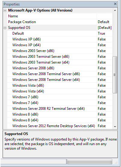 If the App-V package is operating-system-dependent (meaning that it only supports some of the listed operating systems), select True next to the supported operating systems. If any of the listed operating systems are set to True, the value for Default and for Supported OS will automatically switch to False, and the selected operating systems will be listed in brackets next to Supported OS.