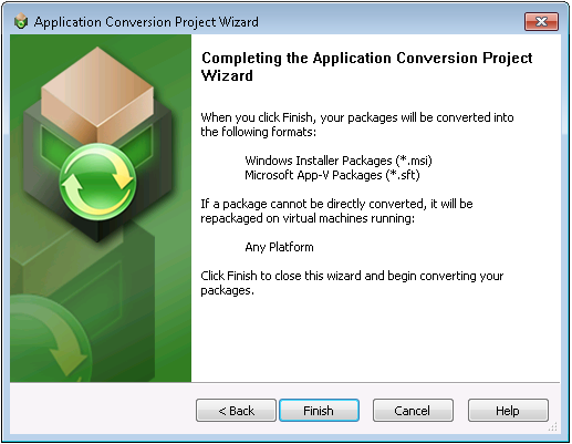 The Application Conversion Project Wizard Complete panel lists the virtual formats that your selected packages will be converted to, and the operating system platform of the virtual machine that will be used to perform repackaging if repackaging is required during conversion.