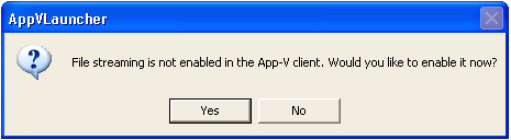 If App-V file streaming in the App-V Client is not enabled, you will be prompted to enable it: