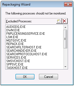 You can open the Excluded Processes dialog box by clicking the Advanced Settings link on the Repackaging Wizard Method Selection Panel. The Excluded Processes dialog box initially lists a default set of processes.